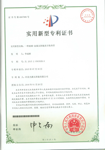 实用新型专利证书--一种玻璃-金属太阳能真空集热管
