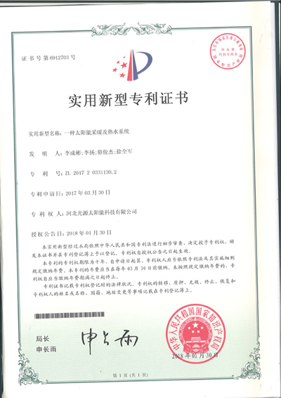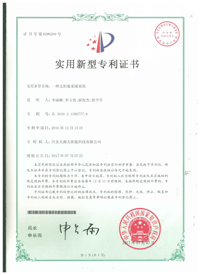 实用新型专利证书--一种太阳能采暖系统