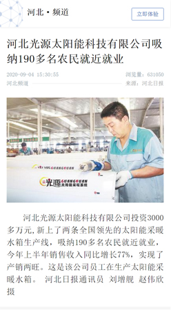 新华社报道说:“河北光源太阳能科技有限公司投资3000多万元,新上了两条全国领先的太阳能采暖水箱生产线,吸纳190多名农民就近就业,今年上半年销售收入同比增长77%,实现了产销两旺?!?/span>