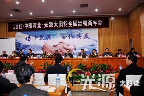 2011年12月12日,邢台宾馆,河北光源太阳能有限公司全国经销商年会盛大举行。全国、省、市新能源行业的领导,以及来自全国各地的900余名经销商出席了大会,现场订货价值4500万元,大会取得圆满成功。