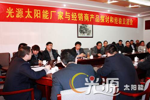 次日上午9点30分,光源太阳能经销商代表与该公司各部门代表举行了座谈会。座谈会上,大家畅所欲言,提出产品在研发、生产、销售、售后等各环节的意见和建议,使各部门更深一步地了解一线市场信息,倾听经销商的心声和呼声,有针对性地做好生产、技术、物流、宣传、促销等工作。