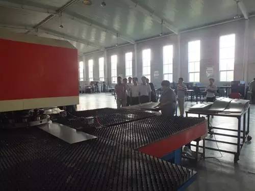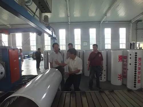 在参观完太阳能真空集热管制造车间后又到了太阳能工程设备总装车间,先后参观了全自动下料开平设备、转塔式全自动数控冲床生产线、全自动外皮双头缩口滚花机、卧式反向积放发泡生产线、环戊烷聚氨酯高压发泡机、全自动数控打包生产线以及壁挂太阳能生产线等等。