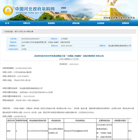 2020年度沙河市“太阳能+电辅热”设备采购项目中标