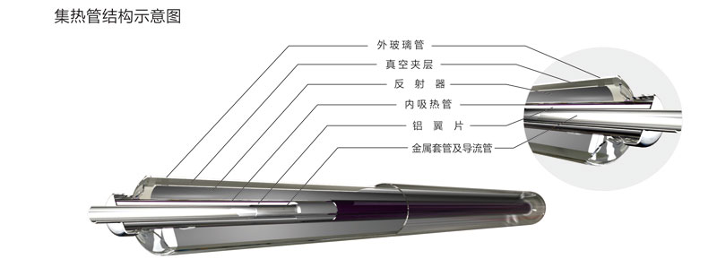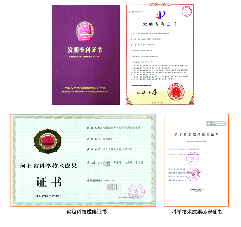 技术特点:一是内置CPC反射器。外罩玻璃管与吸热管采用同轴套管,在真空管内壁下半周设置金属抛物面反射器,运用抛物面原理实现了全角度采光,反射器不受大气污染,聚光效果更好。二是耐高温镀膜技术。内吸热管表面溅射耐高温太阳吸收膜层,内外管之间抽真空,工作温度400℃以上膜层不脱落、不老化。三是强制传质传热技术。在吸热管内插装金属套管,套管内置入金属导热管,使管内的介质容量减少了70%,大大提高了传质传热效率。四是安全承压技术。金属套管与联集箱采用丝扣连接,保证系统工作安全可靠。经权威机构检验,太阳能吸收比、热损系数、真空品质等技术指标均优于国家标准。采用该产品组成的太阳能中高温热利用系统,稳定工作温度可达到163℃蒸汽,真正实现了太阳能由“热水应用”到“热能应用”的跨越式提升,填补了国内太阳能中高温真空集热管在160℃温区的技术空白??萍汲晒ㄈ衔焊貌返淖酆闲阅艽锏搅恕肮诹煜人健?,系统可广泛用于太阳能饮用开水、采暖制冷、食品加工、纺织印染、农副产品烘干等多种行业。对促进大气污染治理,推动我国能源结构调整具有重要意义。